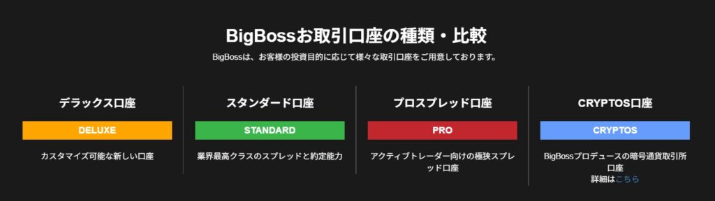 BigBossが提供する各口座タイプ(スタンダード、プロスプレッド、デラックス、CRYPTOS)の特徴や違いを一つずつ解説します。