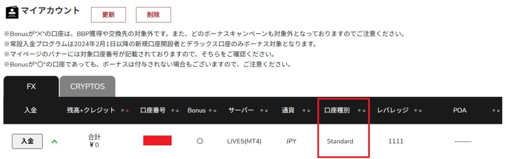 - 口座番号横の「Standard」「Pro」「Deluxe」などの種別を確認する