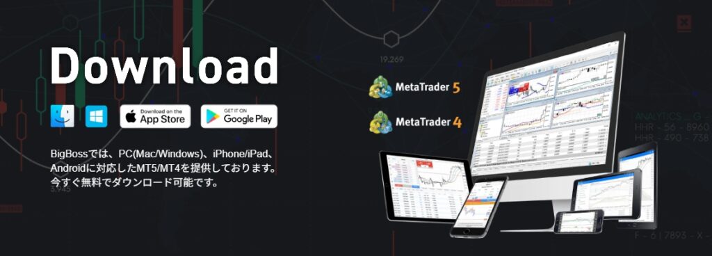 BigBossでは定番のMT4と最新型のMT5が利用でき、PCやスマホに専用アプリをインストールするだけで始められます。