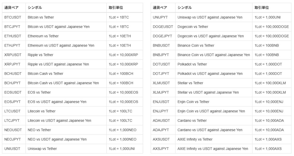 対象となるのはビットコインを含む複数の主要銘柄で、その中でもイーサリアムとビットコインは世界的に取引量が多く、相場の変動も活発です。