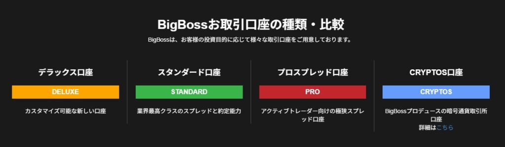 BigBossでは仮想通貨FXを取引できる口座タイプが複数用意されています。