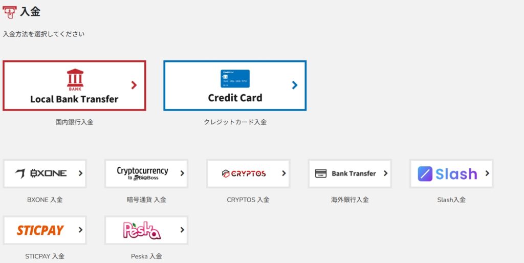 BigBossでは複数の入金方法が用意されているため、自分に合った手段を選びましょう。