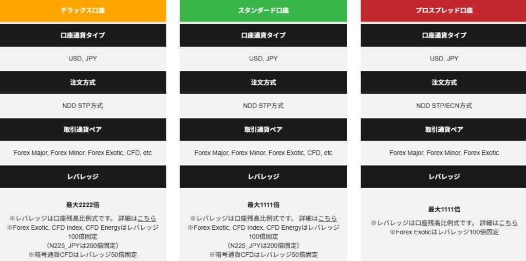 中でも最も高い倍率を誇るのがデラックス口座で、条件を満たせば2,222倍という驚異的なレバレッジが適用されます。