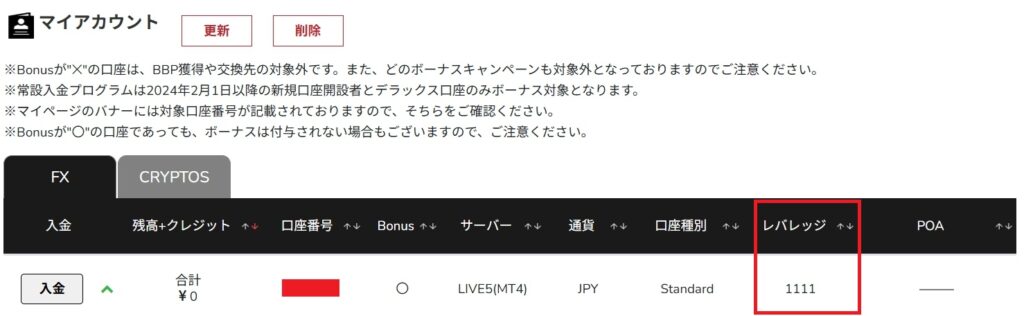 現在は口座ごとに倍率が固定されており、スタンダード口座とプロスプレッド口座は1,111倍、デラックス口座は基本1,111倍です。