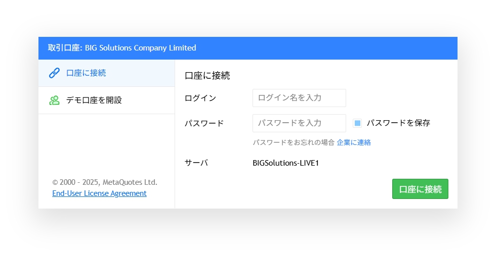 リストに見つからないときは、「live11.bigboss-financial.com:444」などの形式で手動入力すれば追加できます。