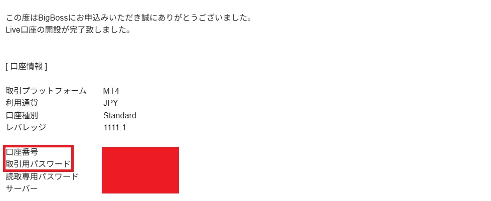 これらは口座開設時にBigBossから送られてくるメール「Live口座開設のお知らせ」に記載されています。