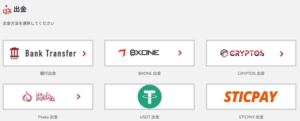 出金には対応しておらず、銀行送金や仮想通貨、オンラインウォレットなど別の手段を選ぶ必要があります。