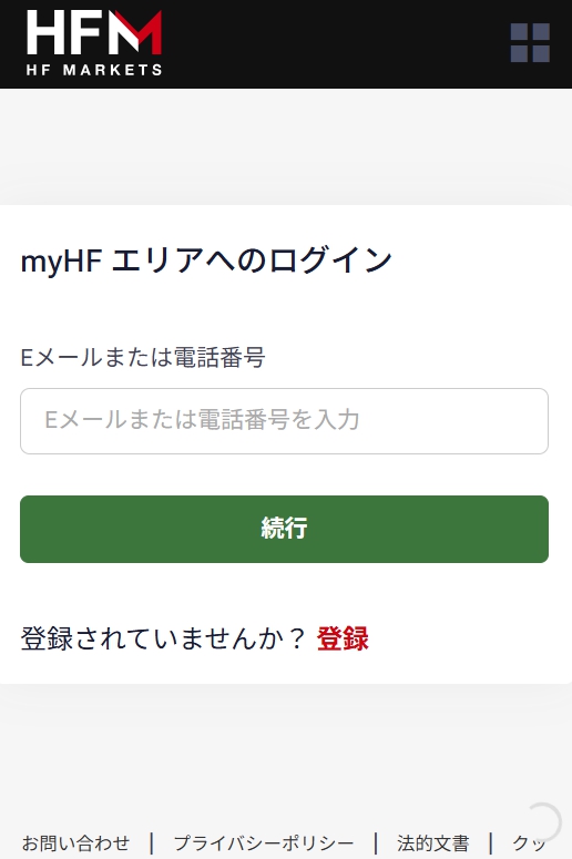 まずスマホのブラウザからHFMの公式サイトへアクセスし、以下の手順でログインを進めます。