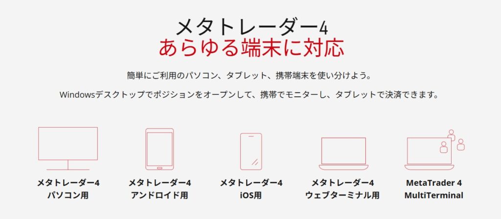 HFMのMT4は、PC・スマホ・タブレットに対応しており、どの端末からでも同じ口座で取引できます。
