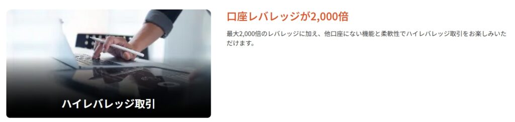 最大レバレッジは2,000倍に設定され、ロスカット水準0%と組み合わせることで、極めて自由度の高いトレードが可能です。