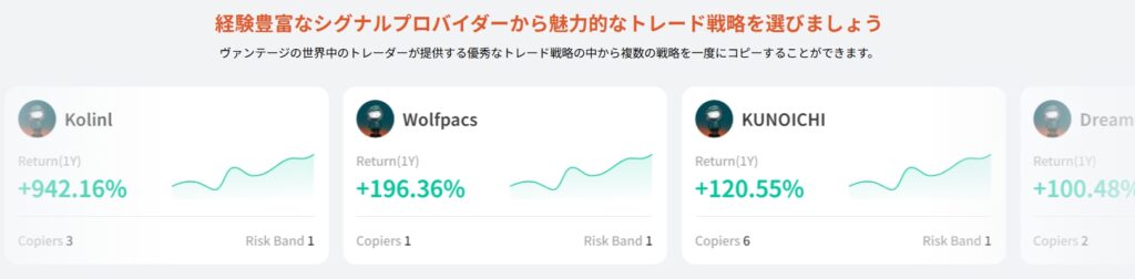 Vantageで選べるプロトレーダーは、年間リターン・勝率・リスクバンド・フォロワー数などのデータで比較できます。