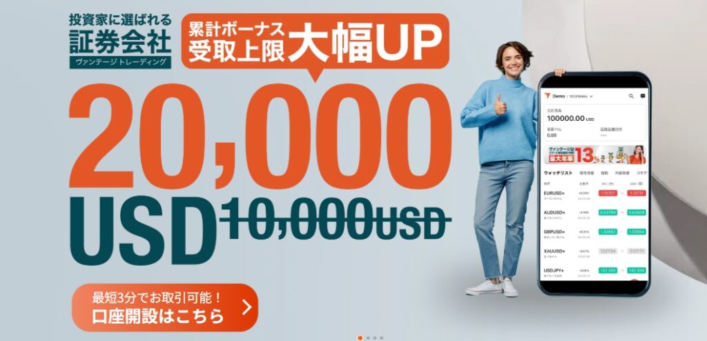Vantageでは新規口座開設や入金時にボーナスが用意されていますが、コピートレード専用口座ではこれらのボーナスは対象外です。