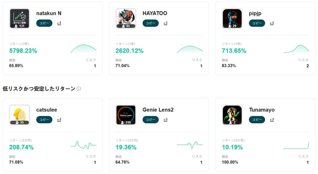 年間収益率や勝率、最大ドローダウン、フォロワー数などが一覧で確認できるため、数字を基準に自分に合ったトレーダーを選ぶことが可能です。