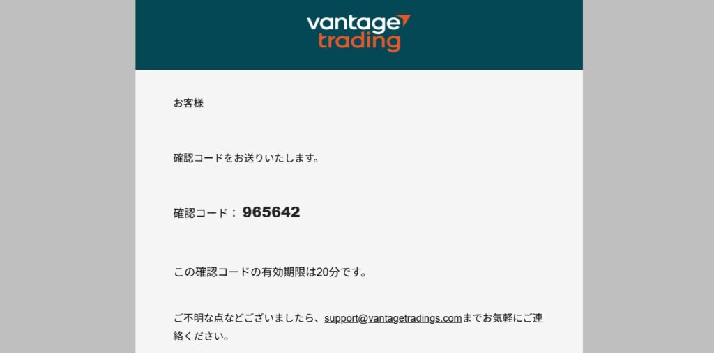 メールアドレスを入力し、「認証コードを受け取る」をクリックすると、Vantageから6桁の認証コード(確認コード)が届きます。