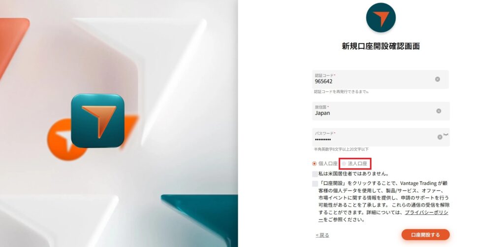 Vantage(ヴァンテージ)の法人口座は、企業や事業主が自社名義で取引を行うための専用口座です。