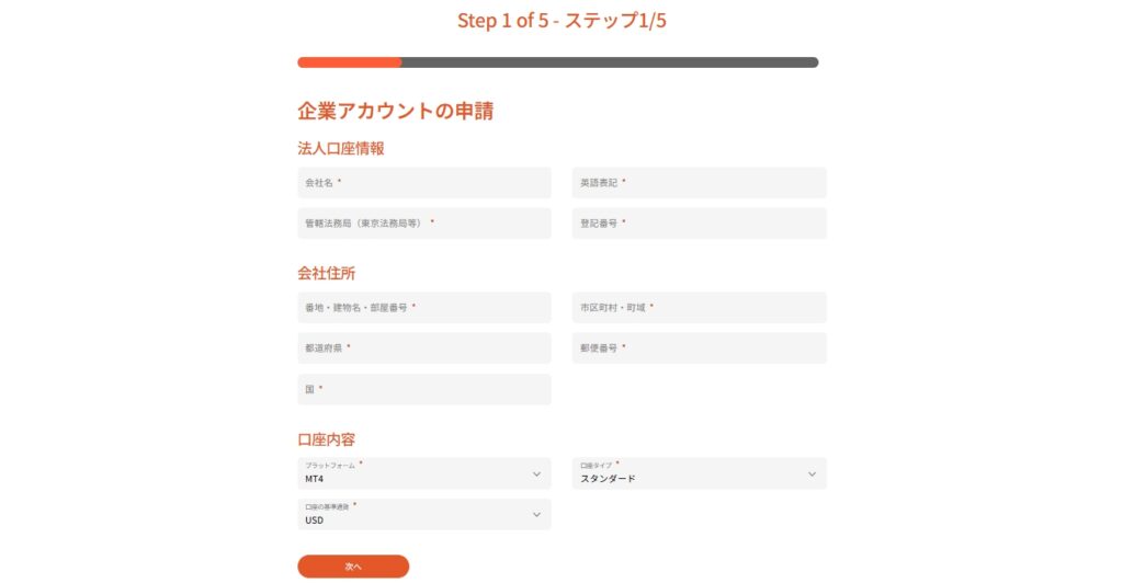 企業アカウントの申請ページにて、法人情報をすべて正しく入力し、取引口座(プラットフォーム、口座タイプ、通貨)を設定します。