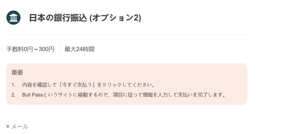• 入金方法の選択:「銀行振込(Japan Bank Transfer)」を選択する