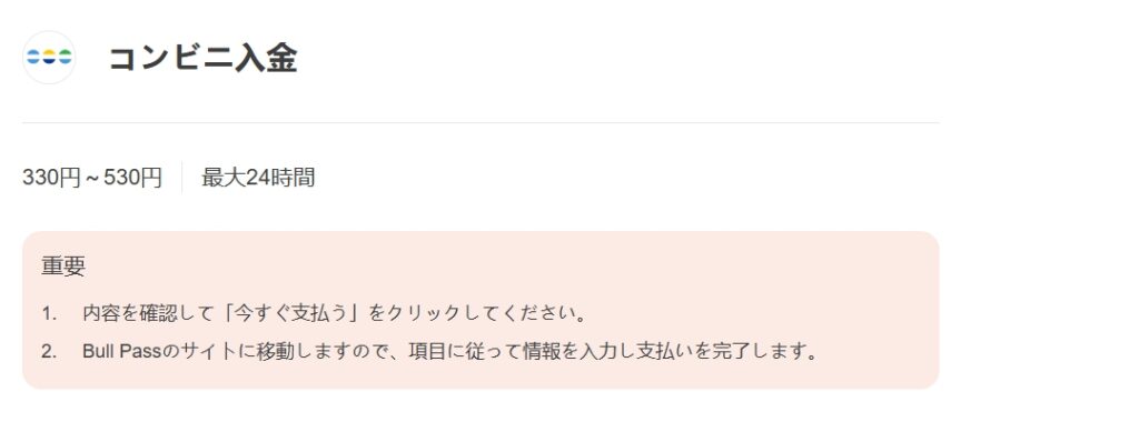 クレジットカードや銀行口座を使わず現金で入金したい場合は、コンビニ決済が便利です。