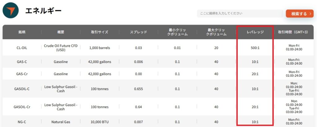 エネルギー市場は価格変動が非常に激しいため、レバレッジ上限が低めに設定されています。