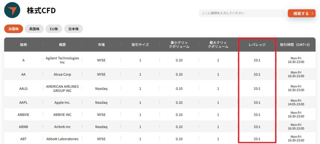 Vantageの株式CFDでは、個別銘柄ごとに最大レバレッジが設定されています。