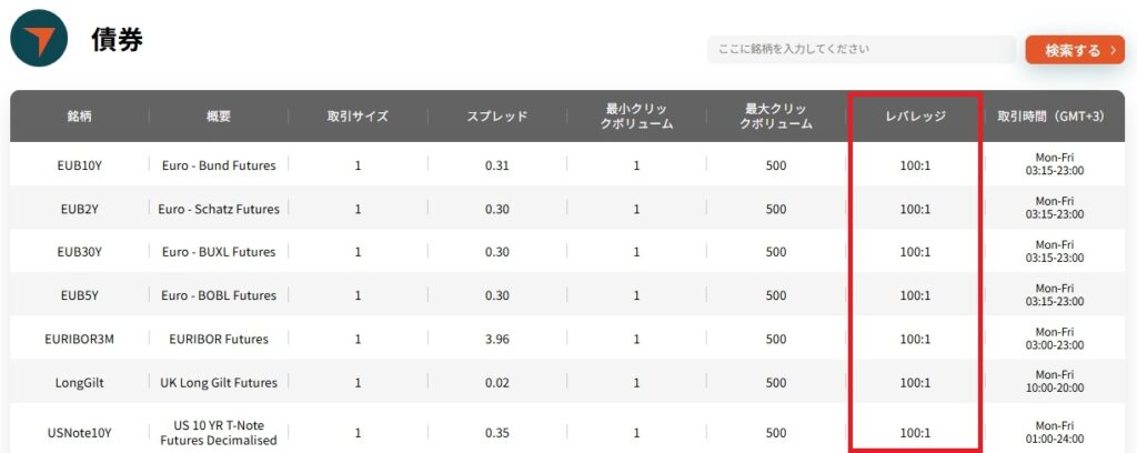 Vantageの債券CFDでは、銘柄ごとに最大レバレッジが異なり、5倍から100倍の範囲で設定されています。