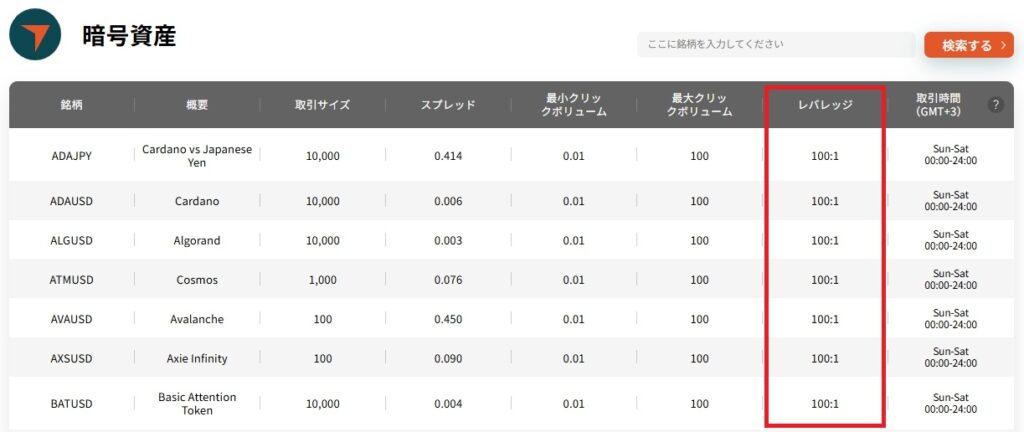 Vantageの仮想通貨CFDでは、銘柄ごとに大きく異なるレバレッジ上限が設定されています。