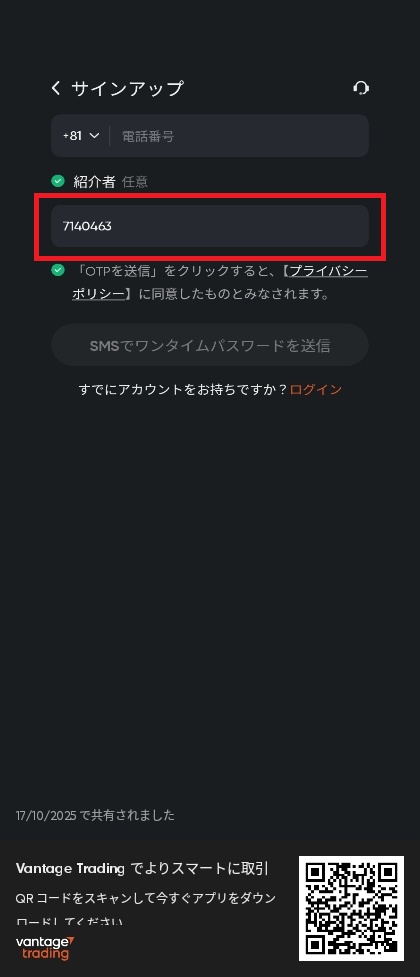 Vantageの紹介コードは、スマートフォンから「Vantage Trading」アプリを使って入力できます。