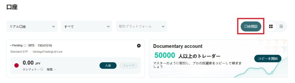 - 「+口座開設」をクリックして新しい口座開設フォームを開く