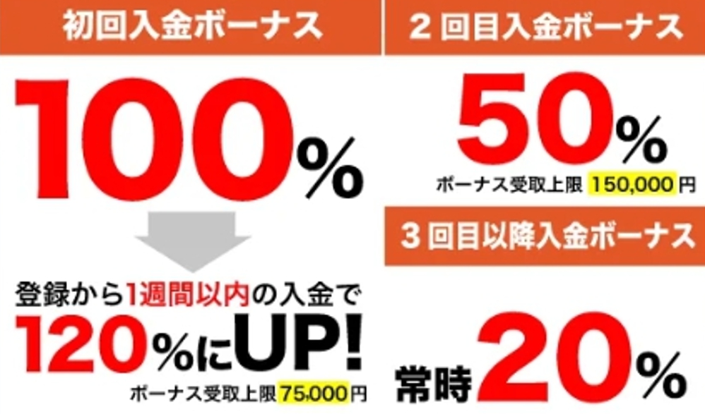 初回入金では120%、2回目で50%、3回目以降も20%のボーナスが付与され、合計で最大約300万円(20,000ドル)相当のクレジットを獲得できます。