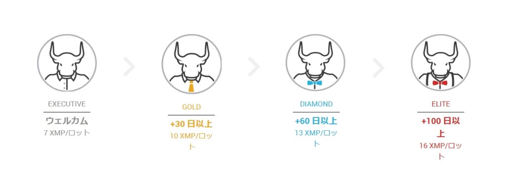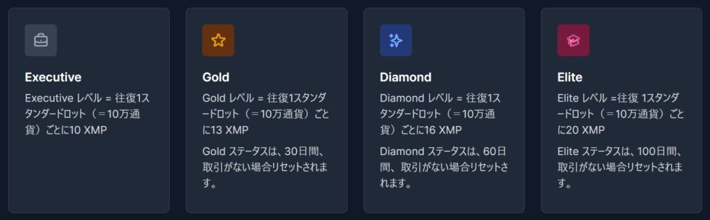 | ロイヤルティポイント(XMP) | 取引量に応じてXMPポイントが自動付与され、ポイントはボーナスや現金に交換可能 ※4段階のステータスで獲得率が変動 |