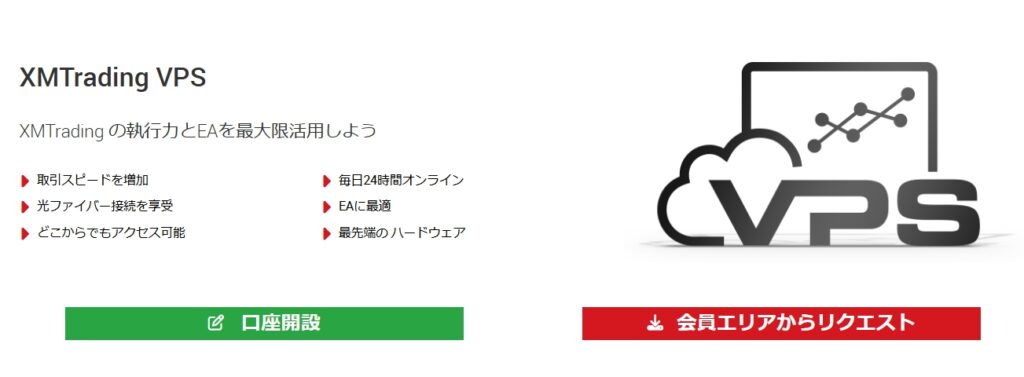 | 無料VPSサービス | 有効証拠金1,000ドル以上&月5ロット以上の取引で無料利用可能 ※EA運用に最適な安定稼働環境を提供 |