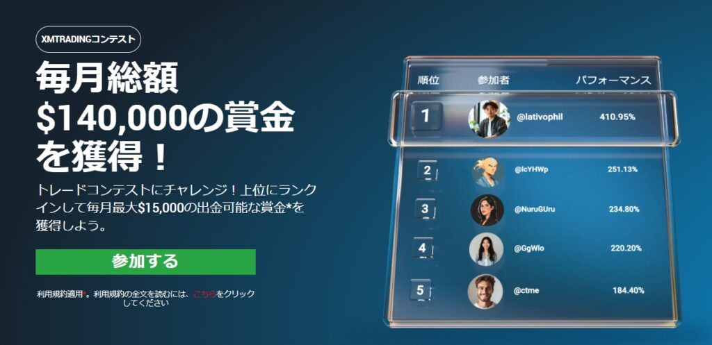 | トレード大会 | 月例のリアルトレード大会(賞金総額10万ドル)と週次デモ大会(賞金総額1万ドル)を開催 ※上位入賞者には現金賞金を配分 |