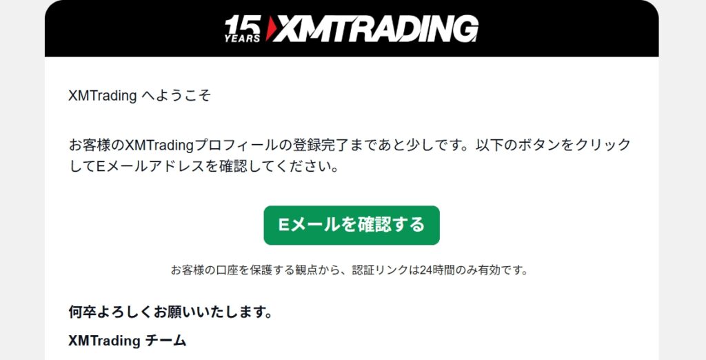 XMから届く確認メールを開き、「Eメールを確認する」のボタンをクリックします。