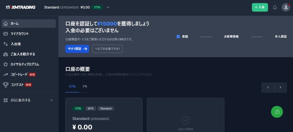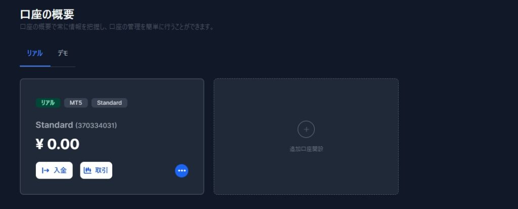 本人確認が承認されたら、会員ページの「追加口座開設」をクリックします。