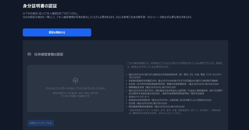 マイページにログインし、身分証明書(運転免許証またはパスポート)と住所確認書類(公共料金の請求書や住民票など)をアップロードします。