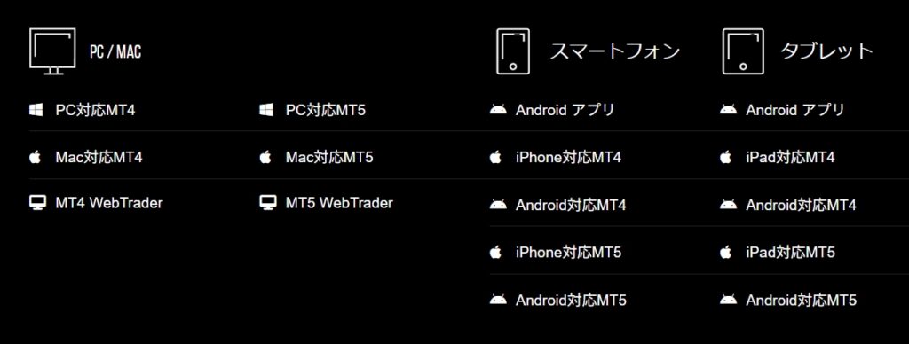 対応端末はパソコン・スマホ・タブレットのほか、ブラウザで使えるWebTrader版もあります。