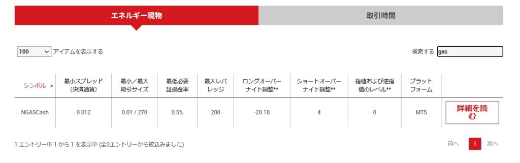 現物は0.01ロット(約10 MMBtu)から取引でき、スプレッドが比較的狭く少額トレードに向いています。