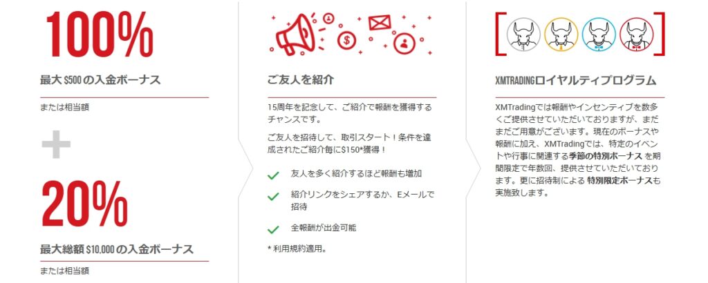 口座開設ボーナス・入金ボーナス・ロイヤルティプログラムの3種類すべてが対象で、取引を重ねるほど恩恵を受けられます。