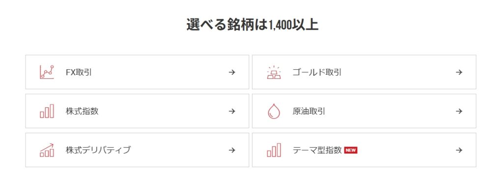 取扱銘柄数1,000種類以上(FX、仮想通貨CFD、株価指数、貴金属、エネルギー、株式CFDなど)