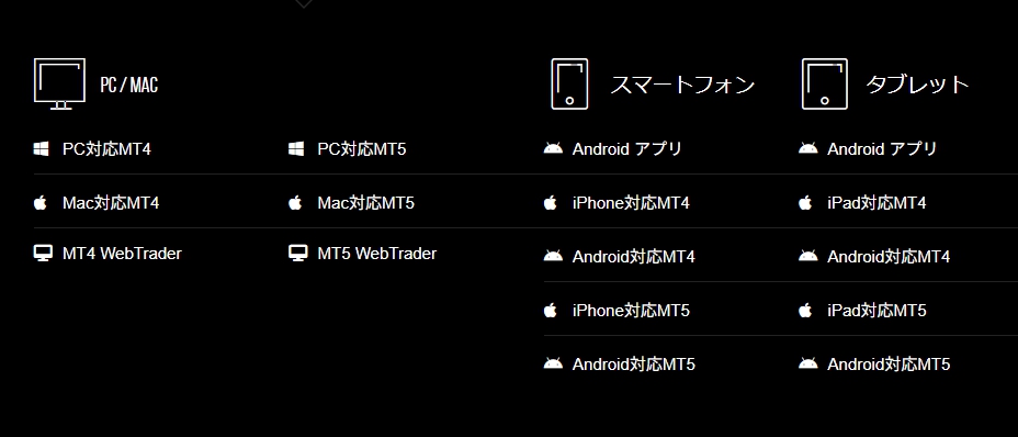 世界的に評価の高いMT4・MT5を採用しており、高精度なチャート分析や自動売買(EA)も使えます。